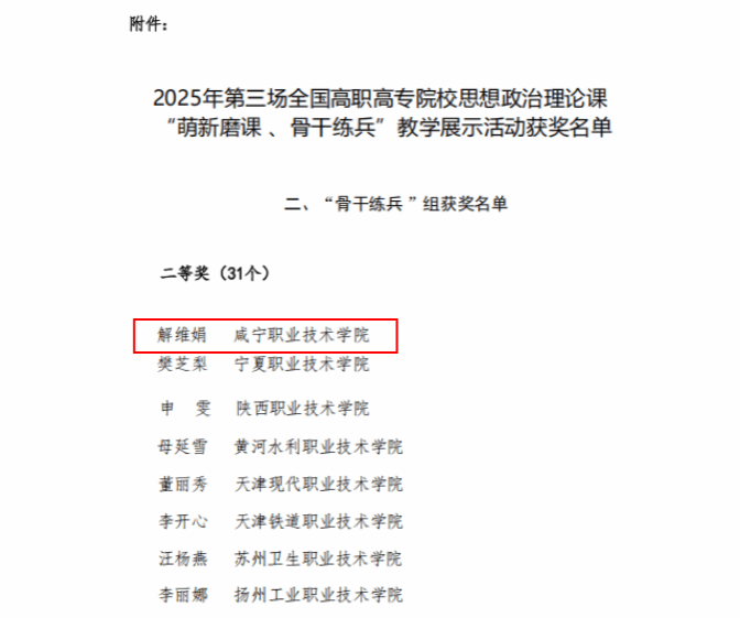 6月14日,2025年第三场全国高职院校思想政治理论课“萌新磨课、骨干练兵”教学展示活动在山西太原圆满落下帷幕。我校教师解维娟荣获“骨干练兵”组二等奖。