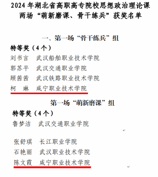 根据《2024 年度全国高职高专院校思想政治理论课“萌新磨课、骨干练兵”活动实施方案》和《关于举办全国高职高专院校思想政治理论课 2024 年度“萌新磨课、骨干练兵”的通知》等文件精神,湖北省高职高专院校思想政治理论课建设联盟举办了两场比赛。经专家评审,在第一场“萌新磨课、骨干练兵”比赛中,正规滚球官网柯琳老师获“骨干练兵”组特等奖,陈文霞老师获“萌新磨课”组特等奖。在第二场“萌新磨课、骨干练兵”比赛中,正规滚球官网解维娟老师获“骨干练兵”组特等奖。